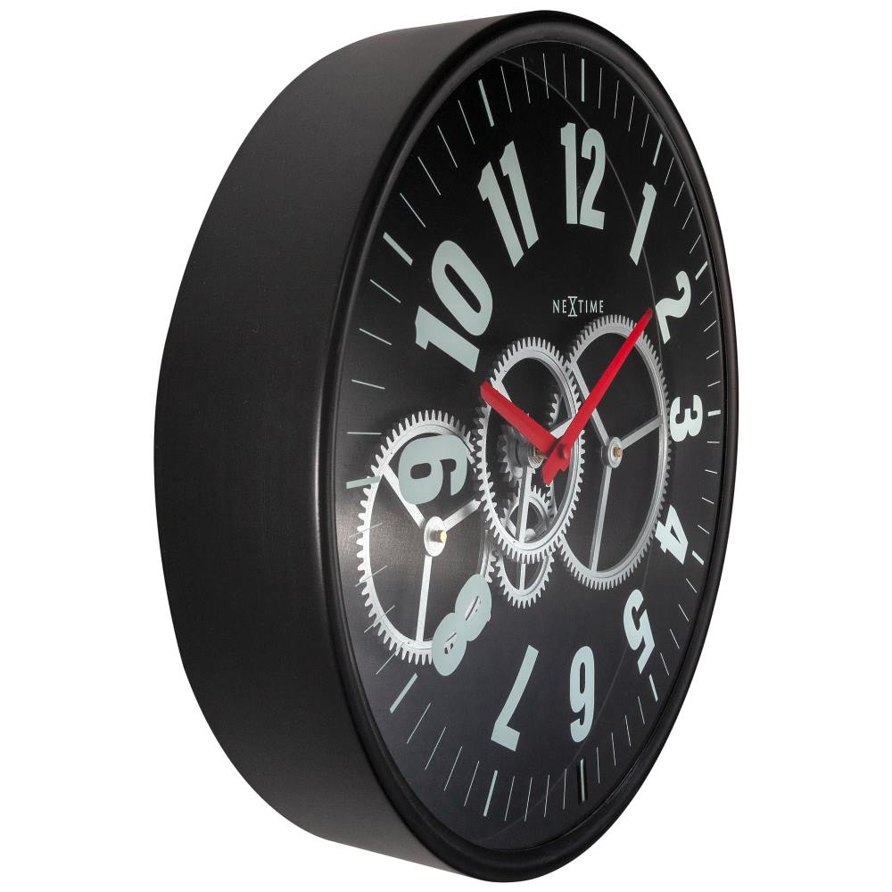 • Klok NE3259ZW is een wandklok met bewegende zilverkleurige draaiende tandwielen.