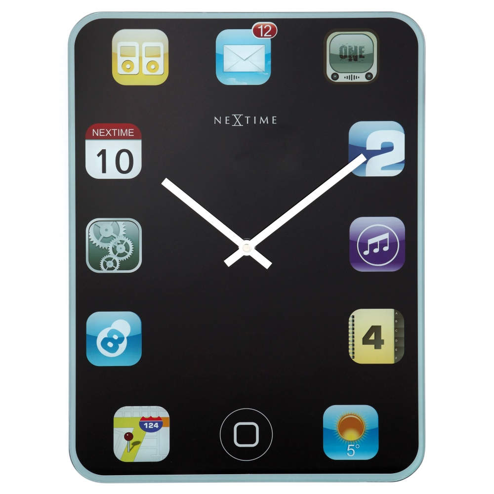 • Klok NE3022 is een wall pad wandklok in tablet design van zwart bedrukt glas met diverse apps afgebeeld.
