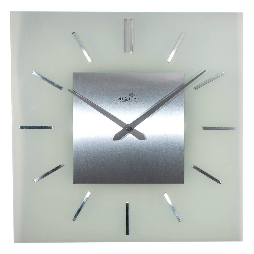 • Klok NE3148 is een vierkante wandklok van mat melkglas opgelegd met een matte vlakke aluminium plaat, urenmarkeringen en wijzers.