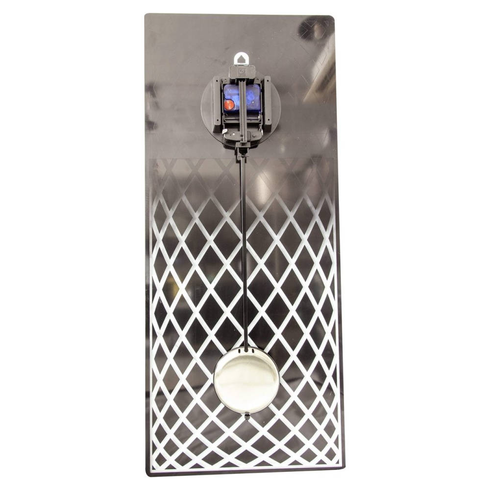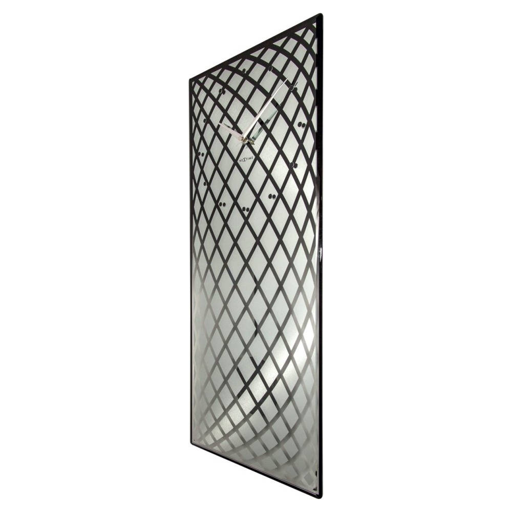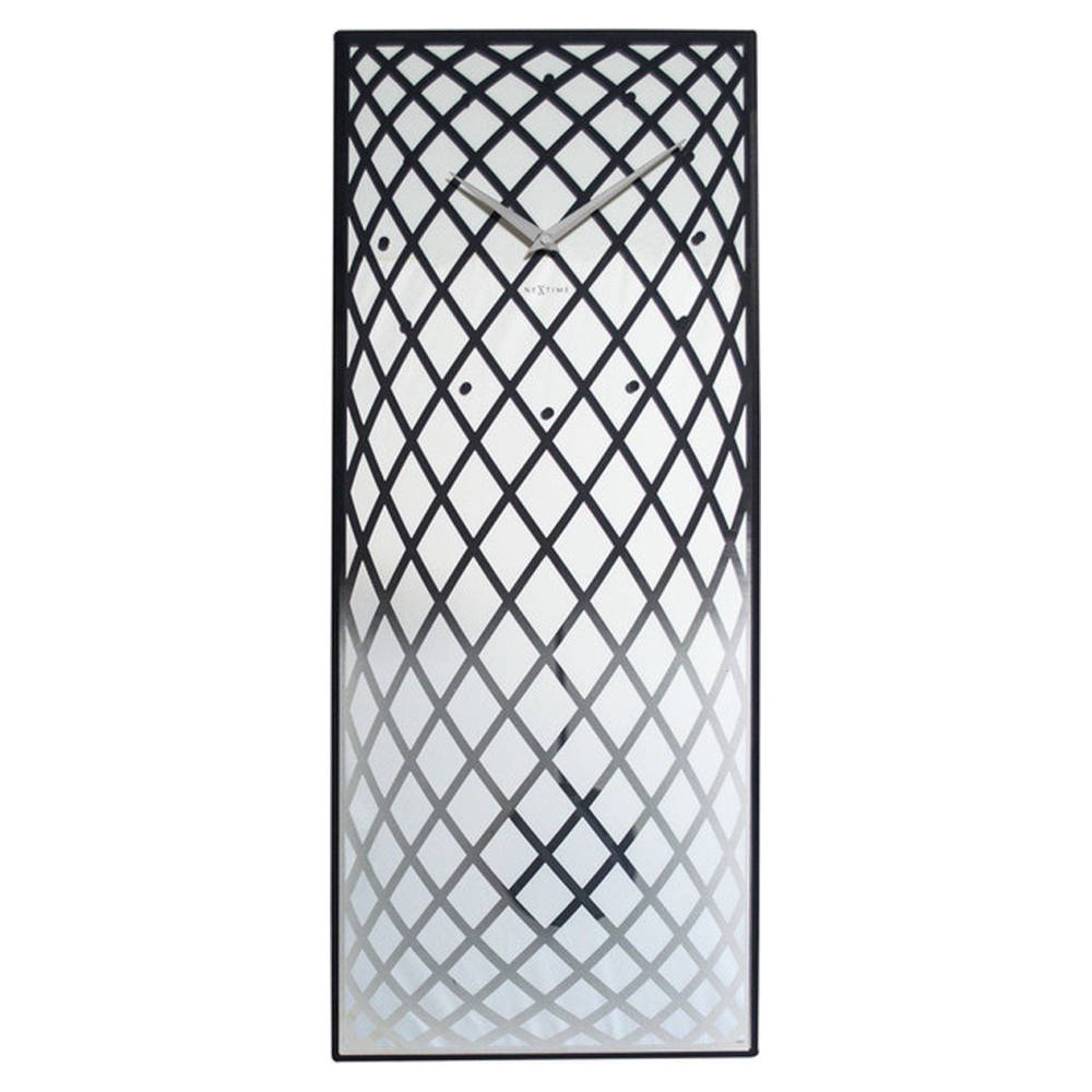 • Klok NE3216ZI is een wandklok van mineraalglas bedrukt met zilver spiegelglas en een zwarte geslepen rand, de zilverkleurige wijzers zijn van metaal.