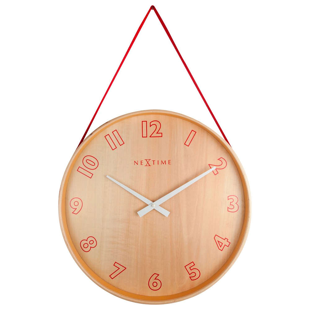 • Klok NE3233RO is een lichthouten wandklok hangend aan een rood gekleurd stoffen lint.