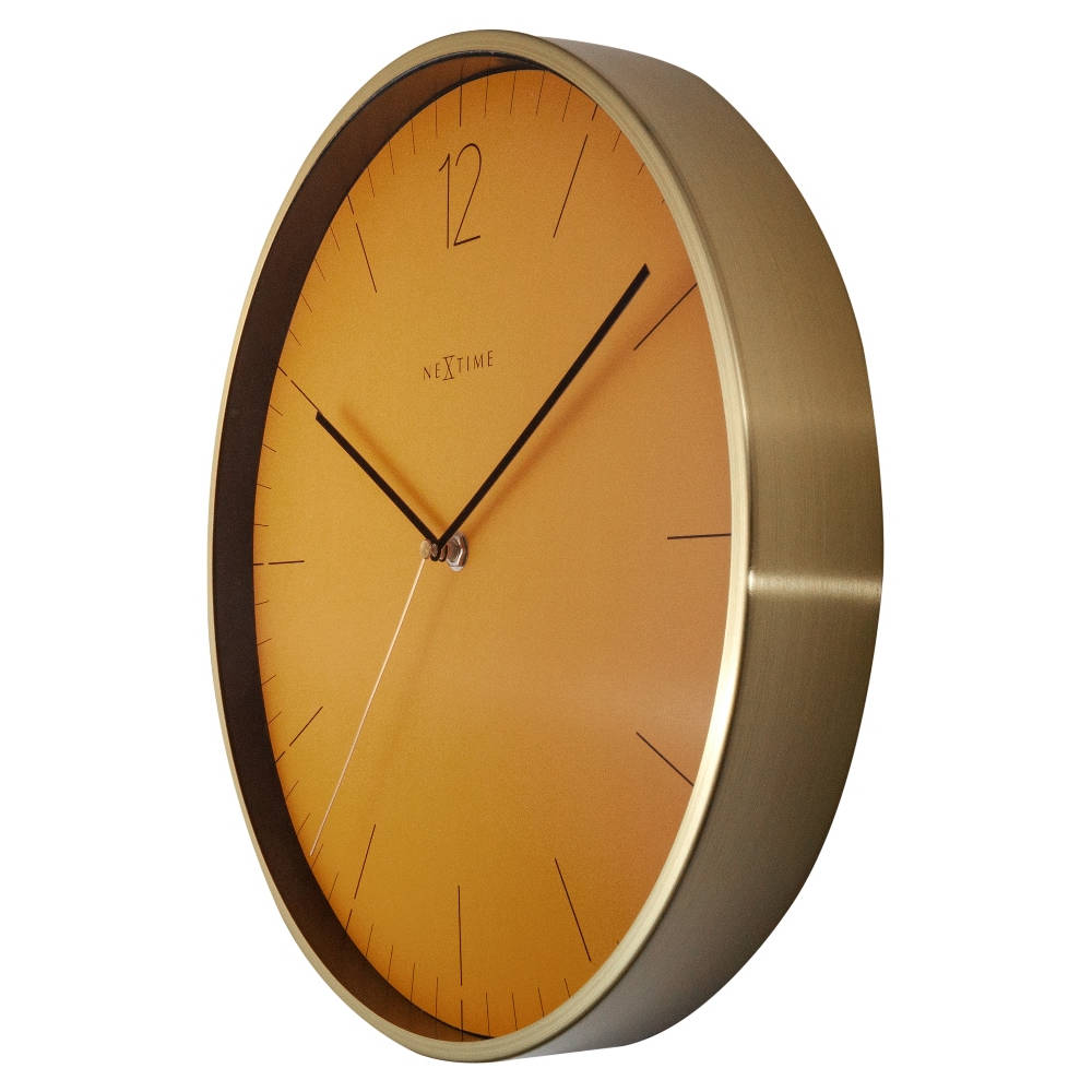 • Klok NE3252FM is een wandklok met een geborstelde matglanzende goudkleurige aluminium rand en okergele-oranje wijzerplaat met opgedrukte zwarte urenmarkeringen.