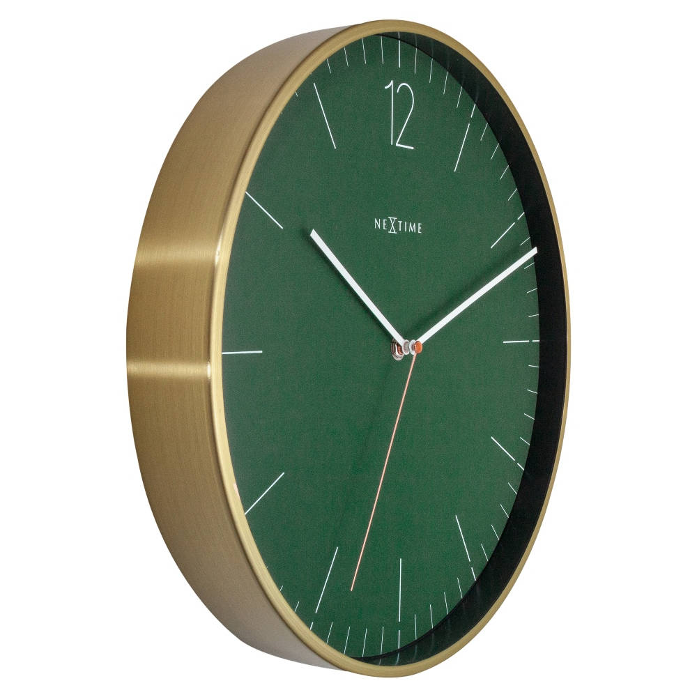 • Klok NE3252GN is een wandklok met een geborstelde matglanzende goudkleurige aluminium rand en mosgroene wijzerplaat met opgedrukte witte urenmarkeringen.