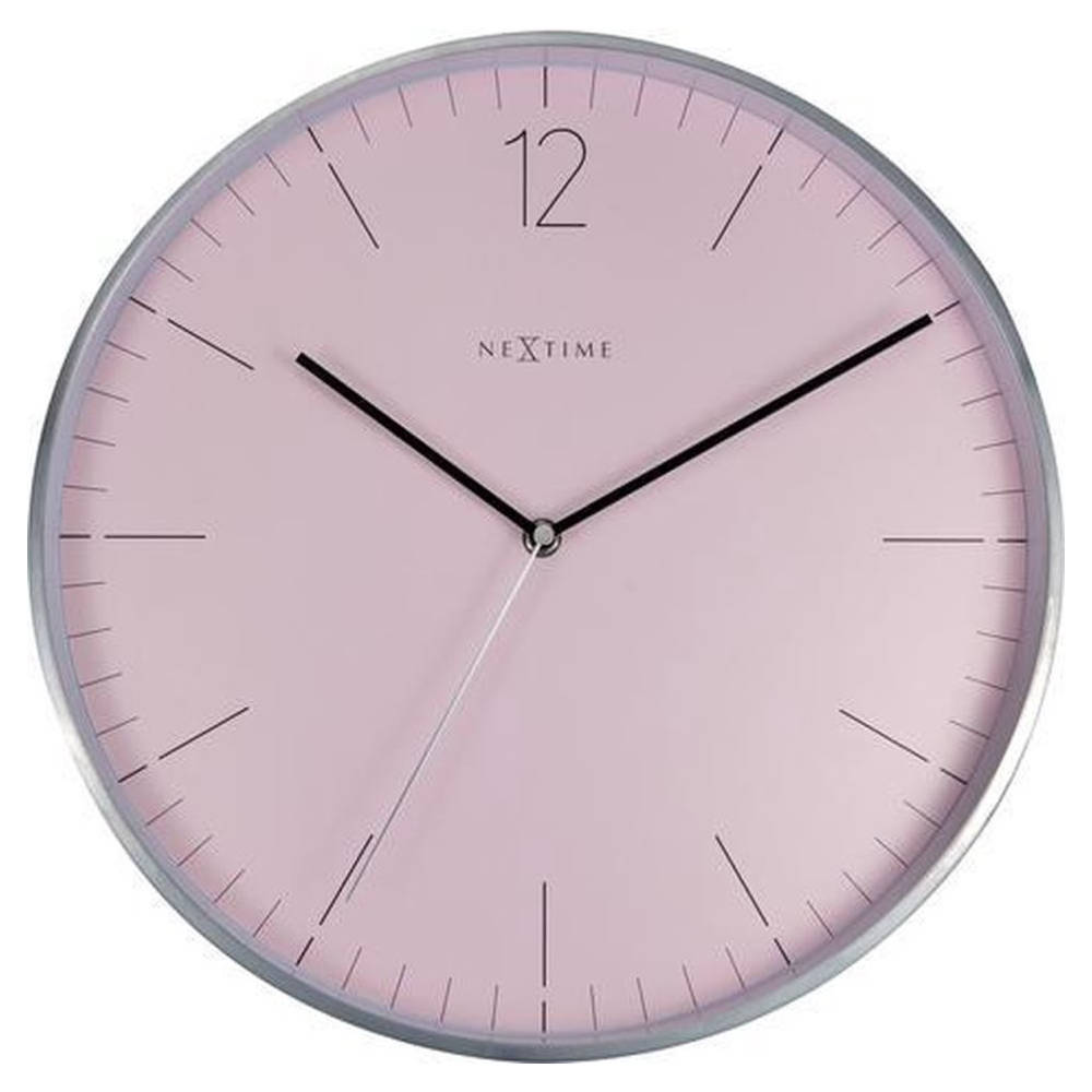 • Klok NE3254RZ is een wandklok met een geborstelde matte aluminium rand en roze wijzerplaat met opgedrukte zwarte urenmarkeringen.
