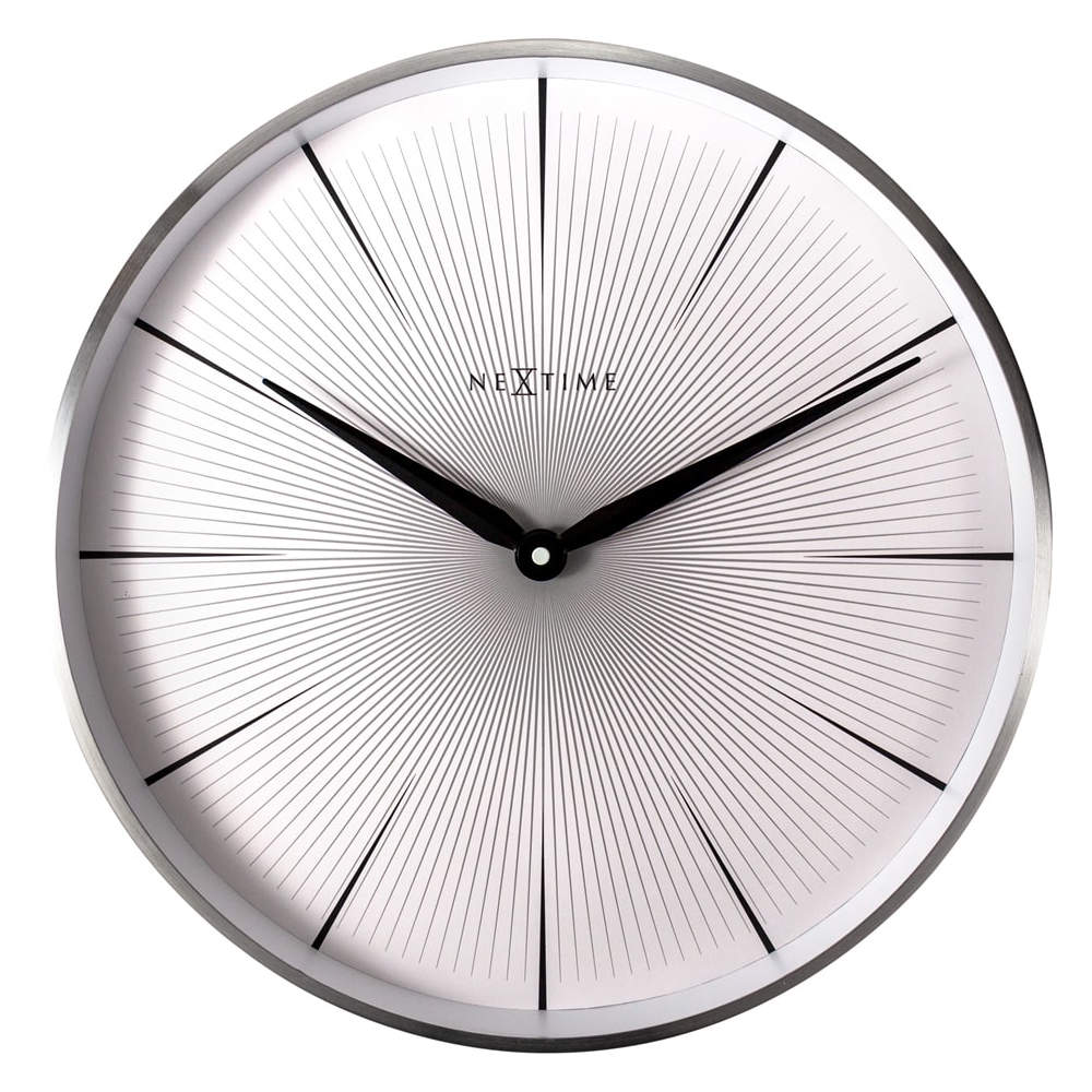 • Klok NE3511WI is een wandklok met een gematteerde metalen rand, zwarte metalen wijzers en een mineraalglas voor de wijzerplaat.