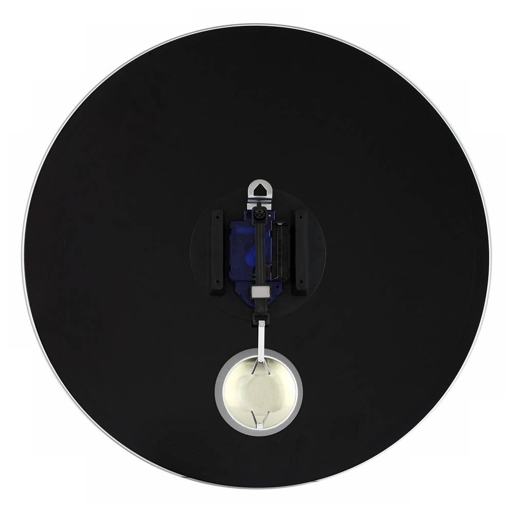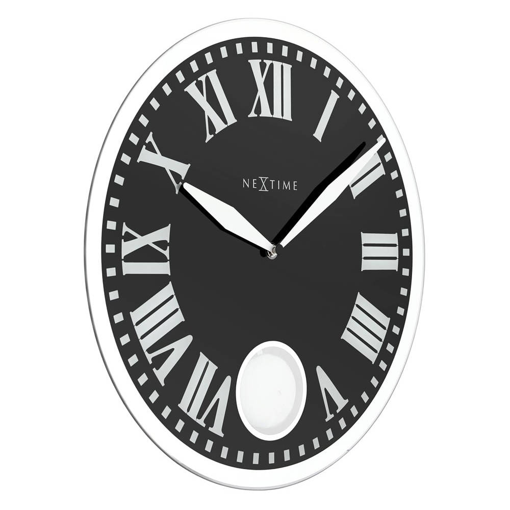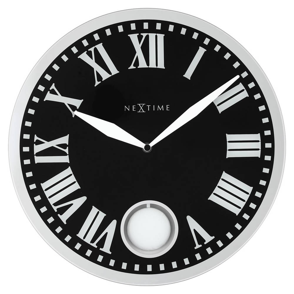 • Klok NE8161 is een wandklok van zwart opgedrukt glas met witte urenmarkeringen, witte metalen wijzers en een glanzend zilverkleurige rand van spiegelglas.