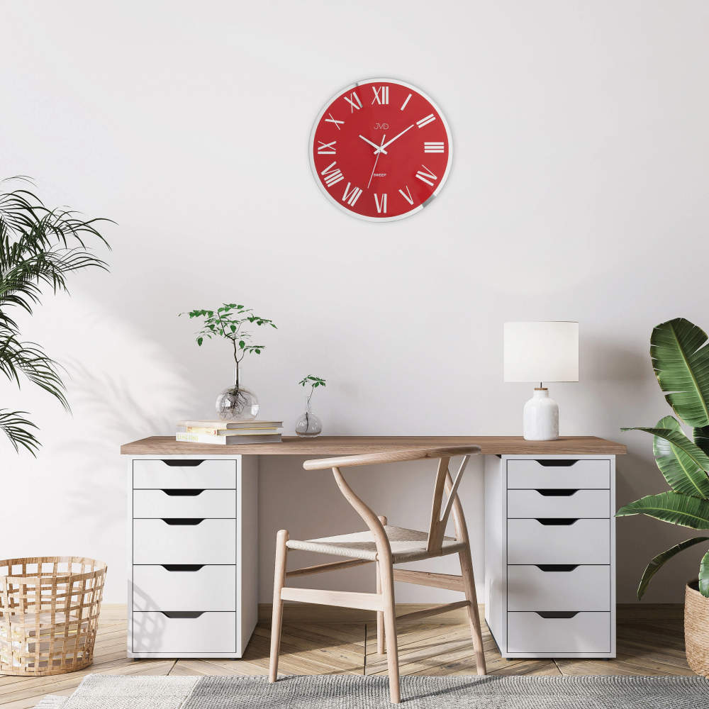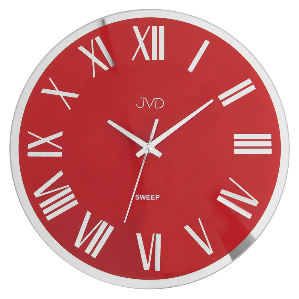 • Klok NS22006-2J is een wandklok in een rood bedrukte spiegelglas uitvoering met zilverkleurige wijzers.