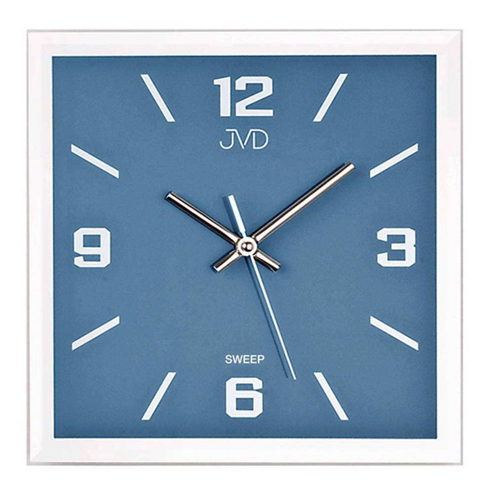 • Klok NS26113-7J is een vierkante wandklok in een blauw bedrukte spiegelglas uitvoering met zilverkleurige wijzers.