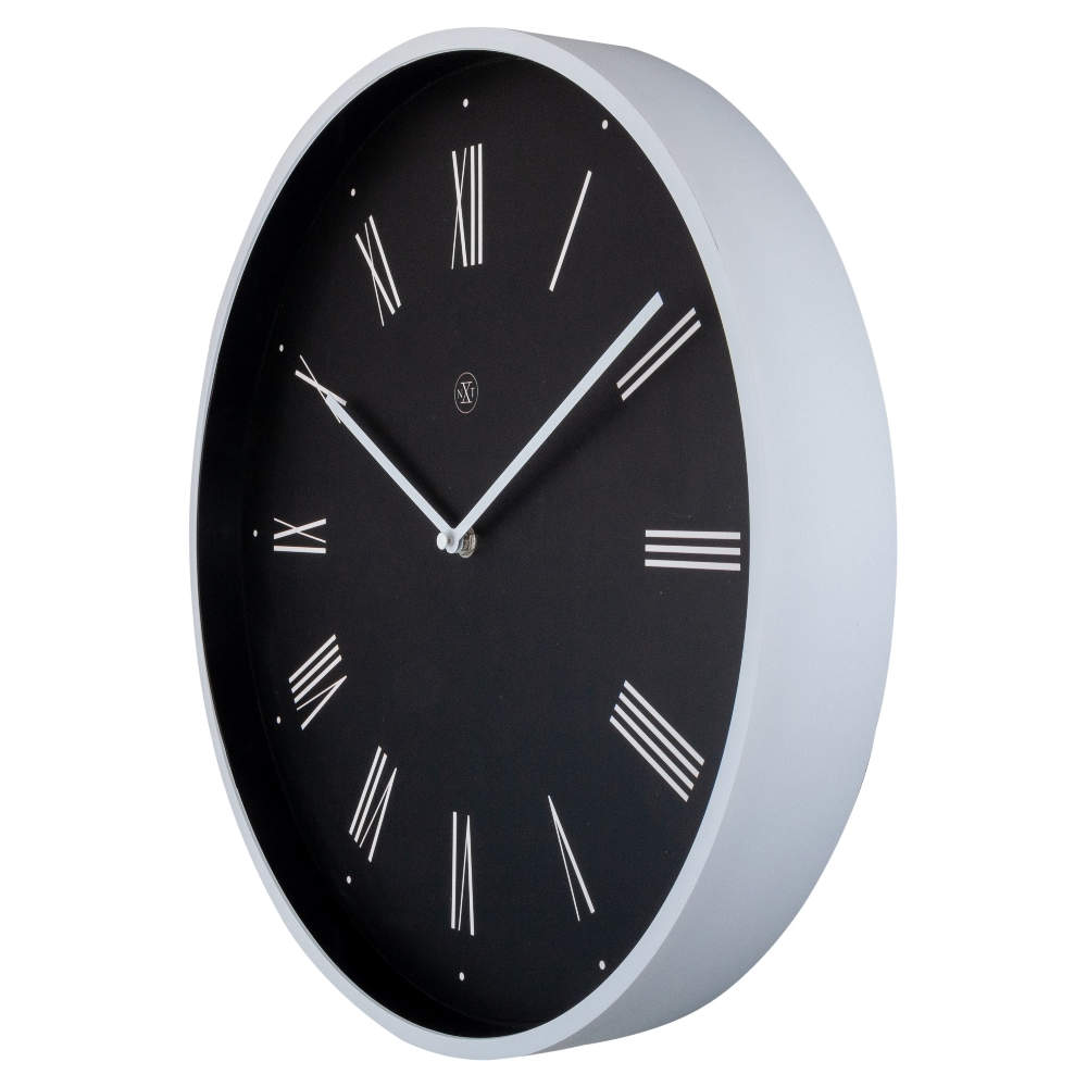 • Klok NX7329ZW is een wandklok met een mat witte kunststof rand en zwarte wijzerplaat die is opgedrukt met witte Romeinse cijfers.
