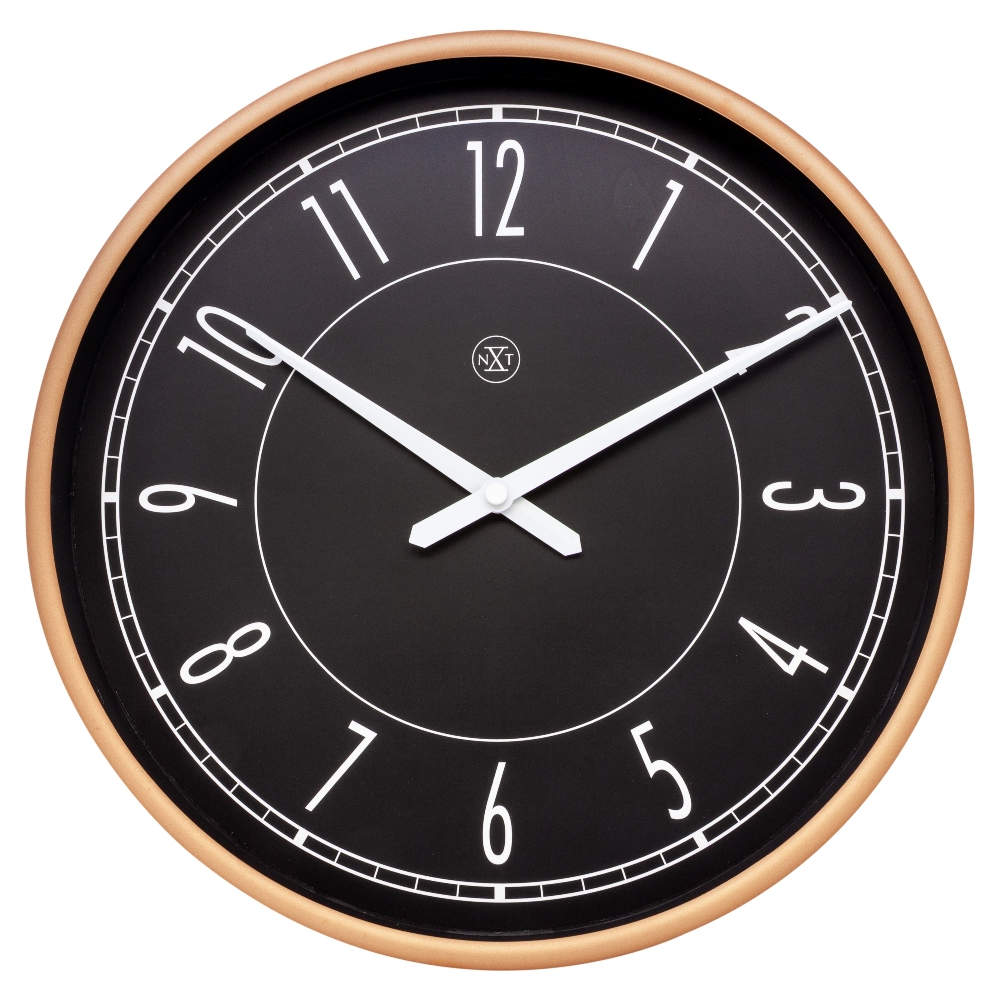 • Klok NX7331 is een wandklok met een mat rosé kunststof rand en zwarte wijzerplaat die is opgedrukt met witte cijfers.