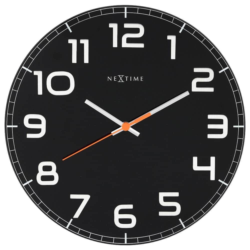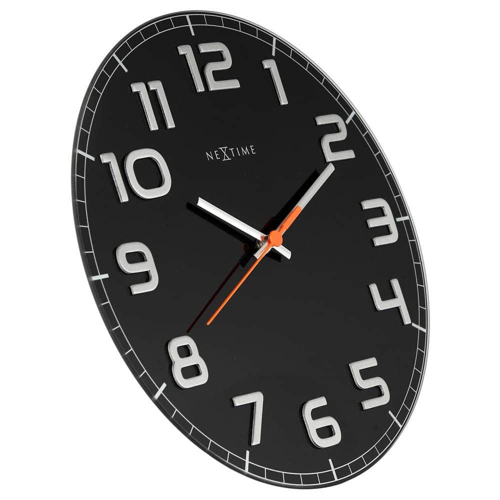 • Klok NE8817ZW is een wandklok van zwart bedrukt glas met opgelegde gematteerde aluminium cijfers, gematteerde zilverkleurige metalen wijzers en een oranje kunststof secondewijzer.