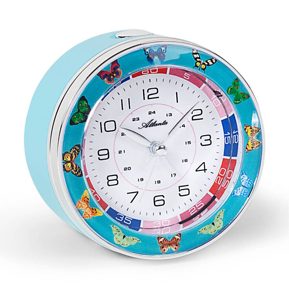 • Wekker 1982-5A is een lichtblauwe kinderwekker met een rand waarop 12 verschillend gekleurde vlinders staan afgebeeld. De wijzers zijn zilver gekleurd.