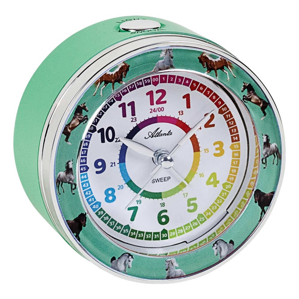• Wekker 1982-6A is een lichtgroene kinderwekker met een rand waarop paarden staan afgebeeld.
