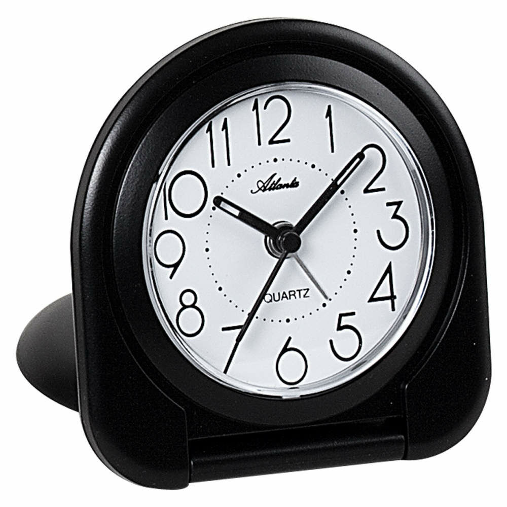 • Wekker 1909-7A is een reiswekker in een zwarte kunststof uitvoering met een glas voor de witte wijzerplaat.